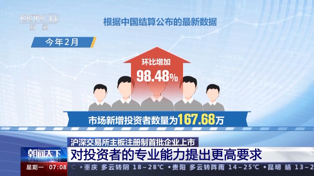 根據(jù)中國結(jié)算公布的最新數(shù)據(jù),今年2月,市場(chǎng)新增投資者數(shù)量為167.68萬,環(huán)比增加98.48%,這是時(shí)隔4個(gè)月之后,市場(chǎng)單月新增投資者數(shù)量再次超過百萬。截至2月末,我國A股投資者已達(dá)到2.14億。專家表示,全面實(shí)行注冊(cè)制,一些市場(chǎng)規(guī)則隨之調(diào)整,投資者需要審慎進(jìn)行判斷。