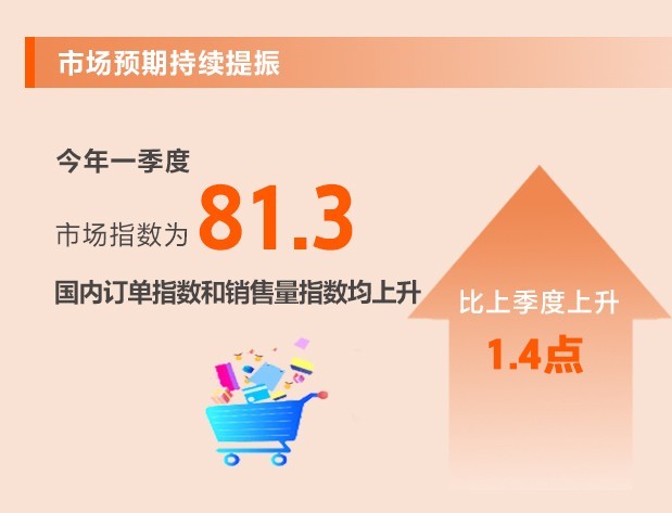 今年以來經(jīng)濟(jì)循環(huán)加快暢通,市場需求逐步恢復(fù),消費(fèi)勢頭有所好轉(zhuǎn),市場預(yù)期明顯恢復(fù)。一季度,市場指數(shù)為81.3,環(huán)比上升1.4點(diǎn)。所調(diào)查的8個行業(yè)中,國內(nèi)訂單指數(shù)和銷售量指數(shù)均上升,7個行業(yè)銷售價(jià)格指數(shù)上升。