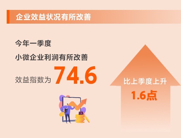 企業(yè)生產(chǎn)經(jīng)營加速恢復(fù),原材料價(jià)格漲幅收窄,以及延續(xù)優(yōu)化減稅降費(fèi)政策減輕企業(yè)負(fù)擔(dān),小微企業(yè)利潤有所改善。一季度,效益指數(shù)為74.6,比上季度上升1.6點(diǎn),反彈幅度較大,但仍處于歷史較低位。所調(diào)查的8個行業(yè)效益指數(shù)均有所上升。