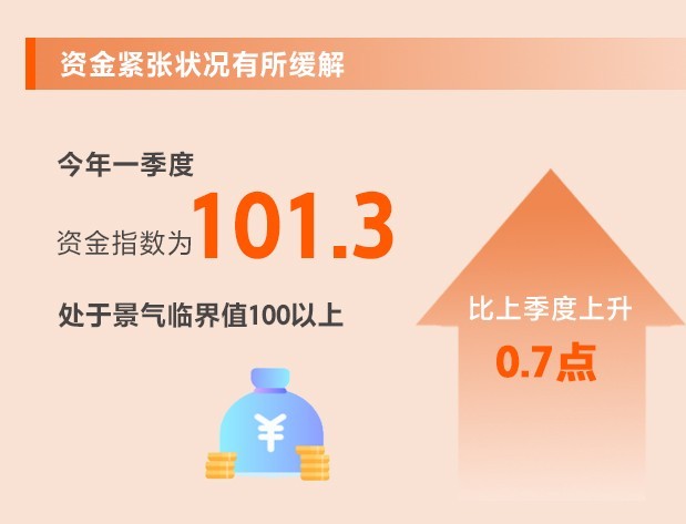 央行降準(zhǔn)以及指導(dǎo)金融機(jī)構(gòu)繼續(xù)支持小微企業(yè),多措并舉“精準(zhǔn)滴灌”,小微企業(yè)融資狀況不斷改善。一季度,資金指數(shù)為101.3,比上季度上升0.7點(diǎn),處于景氣臨界值100以上。其中,流動資金指數(shù)為86.3,比上季度上升1.1點(diǎn);融資指數(shù)為90.8,環(huán)比上升0.5點(diǎn)。所調(diào)查的8個行業(yè)中,8個行業(yè)流動資金指數(shù)、6個行業(yè)融資指數(shù)均上升。