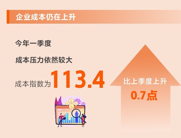 全球通脹仍處于高位,美聯(lián)儲急速加息對世界經(jīng)濟(jì)影響的外溢效應(yīng)持續(xù)顯現(xiàn)。中小企業(yè)多位于產(chǎn)業(yè)鏈下游且面對消費(fèi)者,需求疲弱情況下難以轉(zhuǎn)嫁上游原材料價(jià)格上漲的壓力,同時還面臨人力成本上行以及房屋租金較高等困難。一季度,成本指數(shù)為113.4,比上季度上升0.7點(diǎn),仍處于不景氣區(qū)間,說明成本壓力依然較大。所調(diào)查的8個行業(yè)中,7個行業(yè)生產(chǎn)成本指數(shù)、8個行業(yè)勞動力成本指數(shù)均上升。