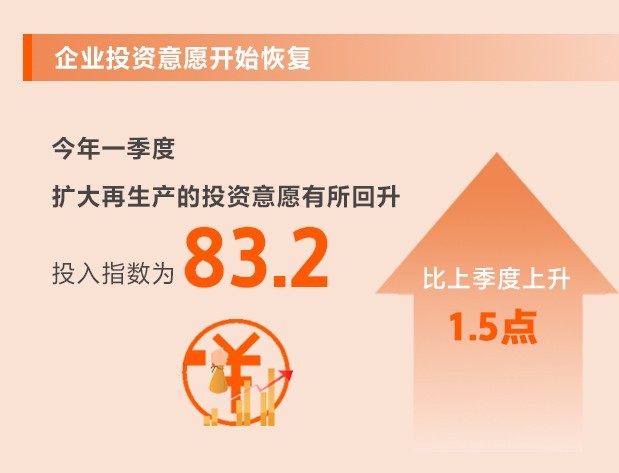 各地投向基礎(chǔ)領(lǐng)域、短板領(lǐng)域、科技創(chuàng)新領(lǐng)域的項(xiàng)目和計(jì)劃增多,企業(yè)對未來的信心有所增強(qiáng),擴(kuò)大再生產(chǎn)的投資意愿有所回升。一季度,投入指數(shù)為83.2,比上季度上升1.5點(diǎn),所調(diào)查的8個行業(yè)投入指數(shù)均上升。