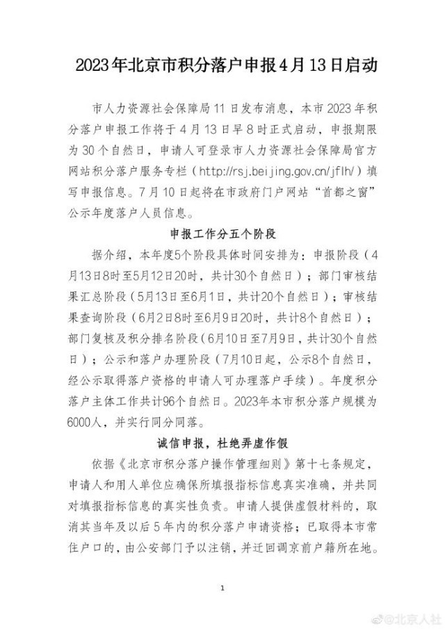 央視網(wǎng)消息:據(jù)@北京人社 微博消息,2023年北京市積分落戶申報(bào)工作將于4月13日早8時(shí)正式啟動。