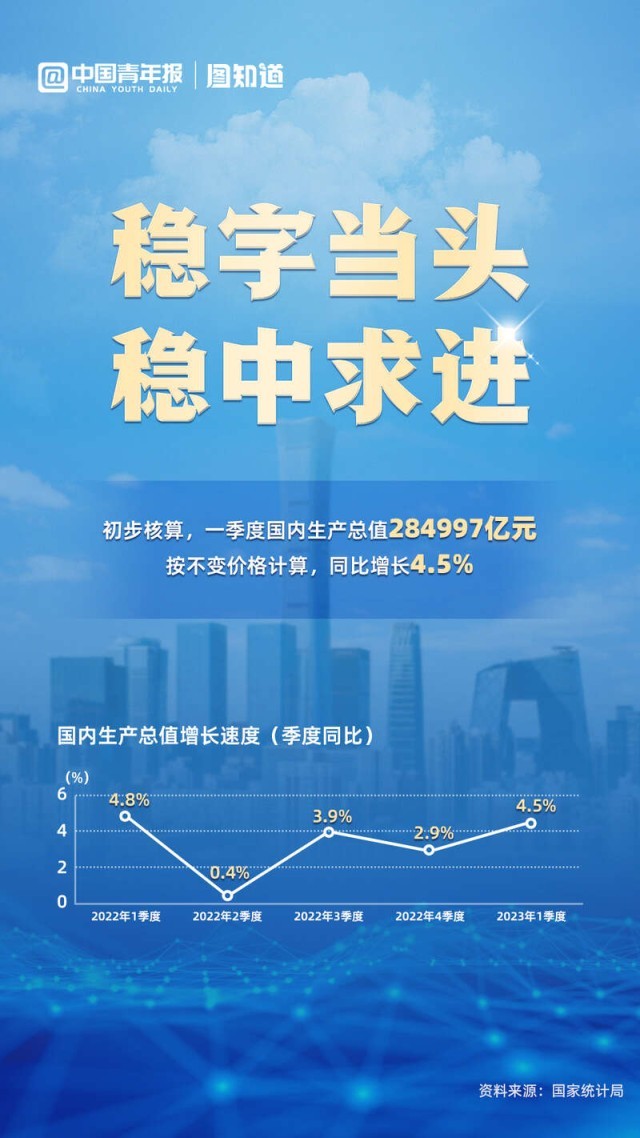 4月18日上午,國家統(tǒng)計局新聞發(fā)言人、國民經(jīng)濟綜合統(tǒng)計司司長付凌暉在介紹2023年一季度國民經(jīng)濟運行情況時說,初步核算,一季度國內(nèi)生產(chǎn)總值284997億元,按不變價格計算,同比增長4.5%。一季度,面對嚴峻復雜的國際環(huán)境和艱巨繁重的國內(nèi)改革發(fā)展穩(wěn)定任務,我國走出穩(wěn)字當頭、穩(wěn)中求進的經(jīng)濟運行開局態(tài)勢。