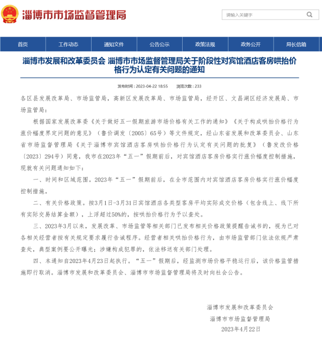 根據(jù)國家發(fā)展改革委《關(guān)于做好五一假期旅游市場價格有關(guān)工作的通知》《關(guān)于構(gòu)成哄抬價格行為漲價幅度界定問題的意見》(魯價調(diào)發(fā)〔2005〕65號)等文件規(guī)定,經(jīng)山東省發(fā)展和改革委員會、山東省市場監(jiān)督管理局《關(guān)于淄博市賓館酒店客房哄抬價格行為認(rèn)定有關(guān)問題的批復(fù)》(魯發(fā)改價格〔2023〕294號)同意,我市在2023年“五一”假期前后,對賓館酒店客房價格實(shí)行漲價幅度控制措施,現(xiàn)就有關(guān)問題通知如下: