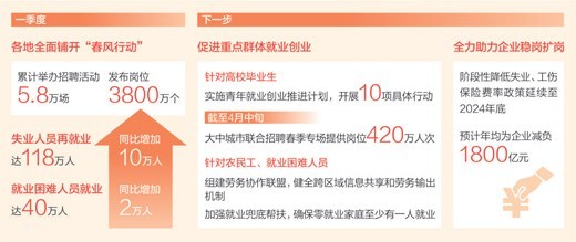 保重點,促進(jìn)重點群體就業(yè)創(chuàng)業(yè)。針對高校畢業(yè)生,將實施促進(jìn)高校畢業(yè)生等青年就業(yè)創(chuàng)業(yè)推進(jìn)計劃,開展10項具體行動,著力拓展就業(yè)渠道、做實做細(xì)就業(yè)服務(wù)、強(qiáng)化困難兜底保障。截至4月中旬,大中城市聯(lián)合招聘春季專場提供崗位420萬人次。針對農(nóng)民工、就業(yè)困難人員,將組建勞務(wù)協(xié)作聯(lián)盟,健全跨區(qū)域信息共享和勞務(wù)輸出機(jī)制。加強(qiáng)困難群體就業(yè)兜底幫扶,確保零就業(yè)家庭至少有一人就業(yè)。