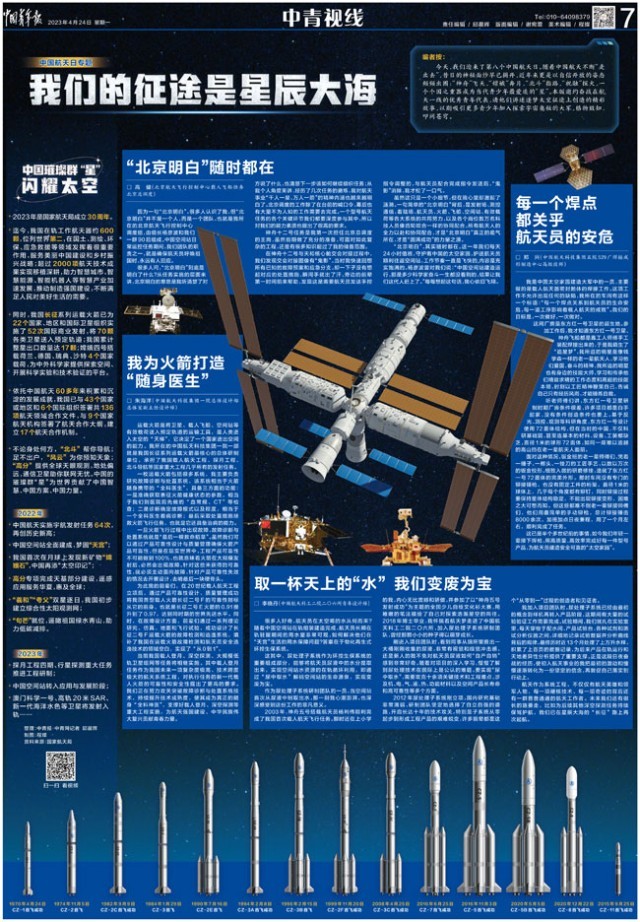 今天,我們迎來了第八個中國航天日。隨著中國航天不斷“走出去”,昔日的神秘面紗早已揭開,近年來更是以自信開放的姿態(tài)頻頻出圈:“神舟”飛天,“嫦娥”奔月,“北斗”指路,“祝融”探火,一個個國之重器成為當(dāng)代青少年最愛追的“星”。本版邀約奮戰(zhàn)在航天一線的優(yōu)秀青年代表,請他們講述逐夢太空征途上創(chuàng)造的精彩故事,以期吸引更多青少年加入探索宇宙奧秘的大軍,格物致知、叩問蒼穹。