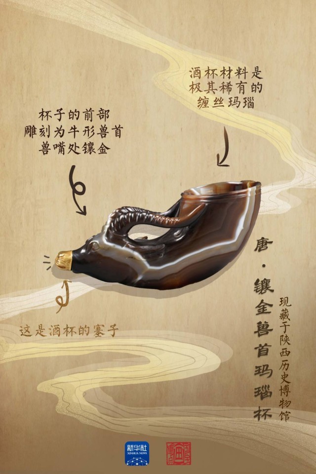 這件鑲金獸首瑪瑙杯,被列為我國禁止出境的珍貴文物之一。角狀杯體由一整塊極為罕見的紅色纏絲瑪瑙雕琢而成,整個(gè)杯體高6.5厘米,長15.6厘米,口徑5.6厘米,其造型與起源于古希臘的酒具“來通”相似,“來通”曾廣泛流行于中亞、西亞地區(qū),沿著絲綢之路不斷東傳進(jìn)入中國。