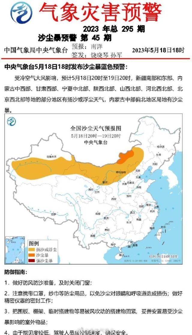 央視網消息:中央氣象臺5月18日18時發(fā)布沙塵暴藍色預警,受冷空氣大風影響,預計5月18日20時至19日20時,新疆南部和東部、內蒙古中西部、甘肅西部、寧夏中北部、陜西北部、山西北部、河北西北部、北京西北部等地的部分地區(qū)有揚沙或浮塵天氣,內蒙古中部偏北地區(qū)局地有沙塵暴。