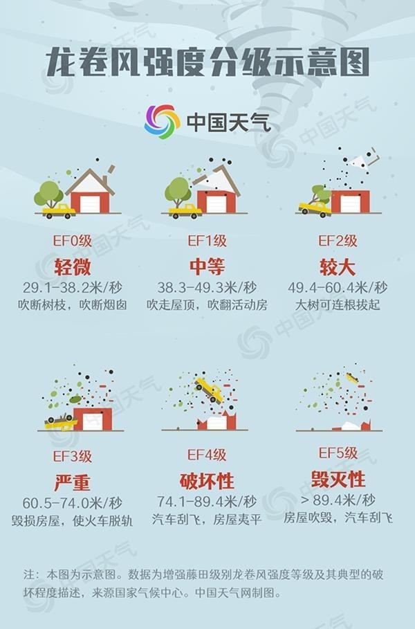 龍卷風生成和消失都迅速,常與雷暴、冰雹和暴雨等強對流天氣系統(tǒng)相伴出現(xiàn),破壞力極強。按藤田級數(shù),龍卷強度分為EF0級至EF5級6個等級,EF0級別最低,EF5為最高級別。