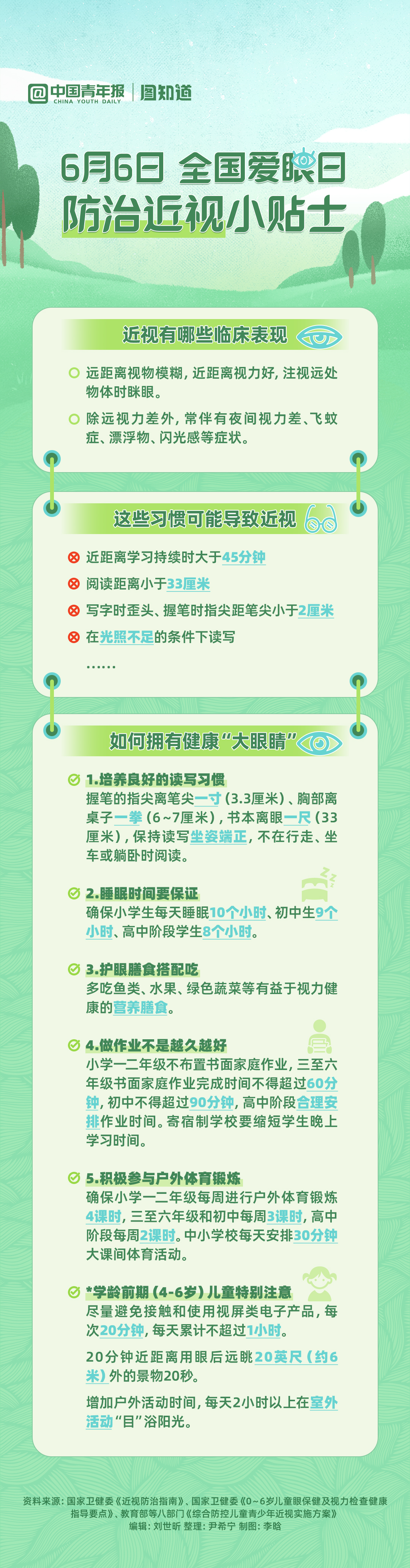 今年6月6日是第28個(gè)全國(guó)愛眼日。國(guó)家衛(wèi)健委數(shù)據(jù)顯示,2022年全國(guó)兒童青少年總體近視率為53.6%。你知道這些防治近視的小知識(shí)嗎:讀寫做到“一寸一拳一尺”;確保小學(xué)生每天睡眠10個(gè)小時(shí);中小學(xué)校每天安排30分鐘大課間體育活動(dòng)……轉(zhuǎn)給身邊的青少年朋友,一起守護(hù)健康“大眼睛”。