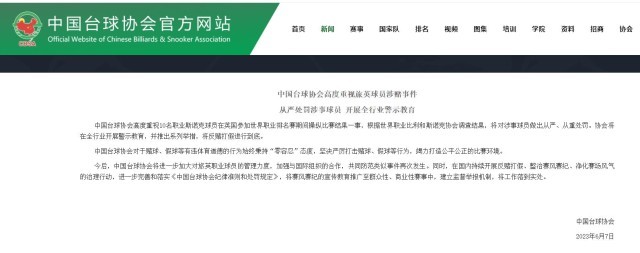 中國臺球協(xié)會:將從嚴(yán)處罰旅英涉賭球員 開展全行業(yè)警示教育