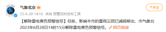 央視網(wǎng)消息:據(jù)@氣象北京微博消息,北京市解除冰雹黃色預警:目前,影響本市的雷雨云團已減弱移出,市氣象臺2023年6月28日14時15分解除雷電黃色預警信號。