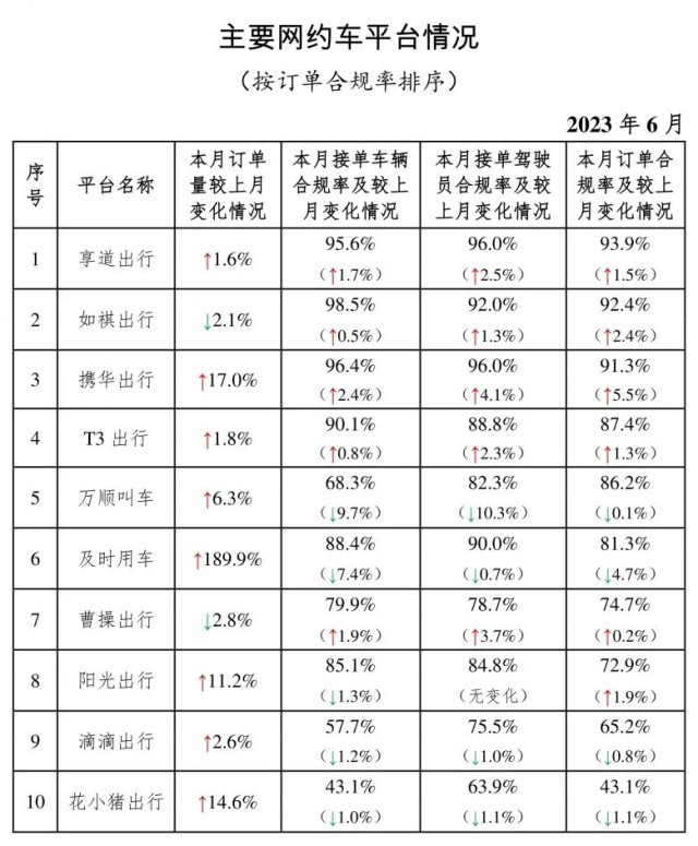 一、在訂單量前10名的網(wǎng)約車平臺(tái)中,訂單合規(guī)率最高的是享道出行,最低的是花小豬出行。在訂單量前10名的平臺(tái)中,按訂單合規(guī)率(指駕駛員和車輛均獲得許可的訂單量占比)從高到低的分別是享道出行、如祺出行、攜華出行、T3出行、萬順叫車、及時(shí)用車、曹操出行、陽光出行、滴滴出行、花小豬出行。本月訂單合規(guī)率增長前3名的依次是攜華出行、如祺出行、陽光出行;增長最后3名的依次是滴滴出行(-0.8%)、花小豬出行(-1.1%)、及時(shí)用車(-4.7%)。