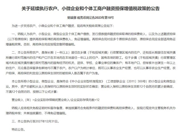 兩部門:延續(xù)執(zhí)行農(nóng)戶、小微企業(yè)和個(gè)體工商戶融資擔(dān)保增值稅政策