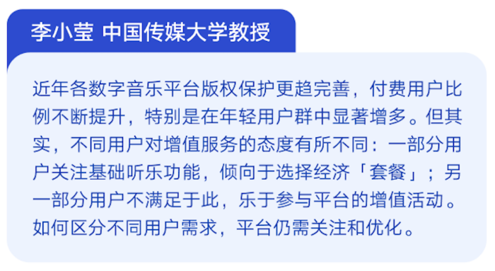 “近年各數(shù)字音樂(lè)平臺(tái)版權(quán)保護(hù)更趨完善,付費(fèi)用戶(hù)比例不斷提升,特別是在年輕用戶(hù)群中顯著增多”,中國(guó)傳媒大學(xué)教授李小瑩指出,不同用戶(hù)對(duì)增值服務(wù)的態(tài)度有所不同:一部分用戶(hù)關(guān)注基礎(chǔ)聽(tīng)樂(lè)功能,傾向于選擇經(jīng)濟(jì)“套餐”;另一部分用戶(hù)不滿足于此,樂(lè)于參與平臺(tái)的增值活動(dòng)。