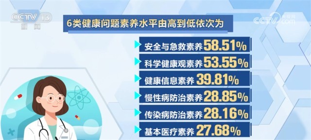 6類健康問題素養(yǎng)水平由高到低依次為:安全與急救素養(yǎng)58.51%、科學健康觀素養(yǎng)53.55%、健康信息素養(yǎng)39.81%、慢性病防治素養(yǎng)28.85%、傳染病防治素養(yǎng)28.16%和基本醫(yī)療素養(yǎng)27.68%。各類健康問題素養(yǎng)均有不同程度提升,其中,健康信息素養(yǎng)水平增幅最大,較2021年提升了3.88個百分點。本次監(jiān)測覆蓋31個?。ㄗ灾螀^(qū)、直轄市)的336個縣(區(qū))1008個鄉(xiāng)鎮(zhèn)(街道),對象為15—69歲常住人口。