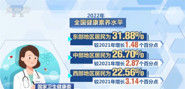 監(jiān)測結果顯示,2022年,全國城市居民健康素養(yǎng)水平為31.94%,農村居民為23.78%,較2021年分別增長1.24和1.76個百分點。東、中、西部地區(qū)居民健康素養(yǎng)水平分別為31.88%、26.70%和22.56%,較2021年分別增長1.48、2.87和3.14個百分點。城鄉(xiāng)居民基本知識和理念素養(yǎng)水平為41.26%,健康生活方式與行為素養(yǎng)水平為30.63%,基本技能素養(yǎng)水平為26.00%,較2021年分別提升3.60、2.58、1.72個百分點。