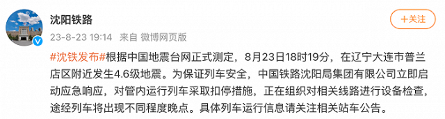 央視網(wǎng)消息:據(jù)@沈陽鐵路 微博消息,根據(jù)中國地震臺網(wǎng)正式測定,8月23日18時(shí)19分,在遼寧大連市普蘭店區(qū)附近發(fā)生4.6級地震。為保證列車安全,中國鐵路沈陽局集團(tuán)有限公司立即啟動(dòng)應(yīng)急響應(yīng),對管內(nèi)運(yùn)行列車采取扣停措施,正在組織對相關(guān)線路進(jìn)行設(shè)備檢查,途經(jīng)列車將出現(xiàn)不同程度晚點(diǎn)。具體列車運(yùn)行信息請關(guān)注相關(guān)站車公告。