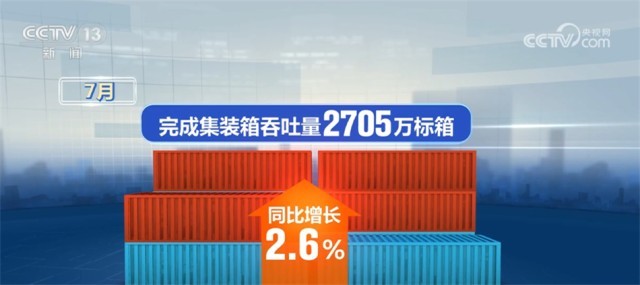 7月,全國港口貨物吞吐量達(dá)14.3億噸,同比增長6.6%,其中,內(nèi)、外貿(mào)吞吐量同比分別增長5.8%和8.5%。完成集裝箱吞吐量2705萬標(biāo)箱,同比增長2.6%。