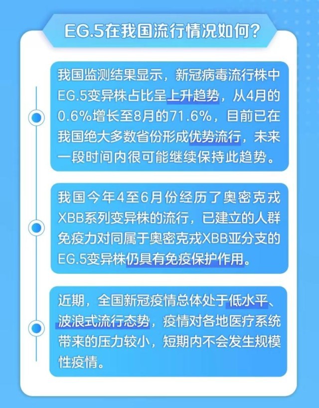 根據(jù)我國最新監(jiān)測數(shù)據(jù),新冠病毒流行株中EG.5變異株占比呈上升趨勢,從4月的0.6%增長至目前的71.6%,已在我國絕大多數(shù)省份形成優(yōu)勢流行,未來一段時(shí)間內(nèi)很可能繼續(xù)保持此趨勢。對(duì)此,國家疾控局表示,EG.5感染者與其他XBB亞分支感染者的臨床分型無明顯差異,近期全國新冠疫情總體處于低水平、波浪式流行態(tài)勢,對(duì)各地醫(yī)療系統(tǒng)帶來的壓力較小。