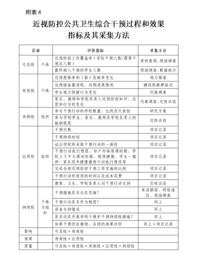 2.注重過程與效果評(píng)價(jià)。各級(jí)疾控機(jī)構(gòu)要定期開展學(xué)生視力監(jiān)測工作,深入分析歷年監(jiān)測數(shù)據(jù),將監(jiān)測發(fā)現(xiàn)的主要學(xué)生健康問題和建議及時(shí)報(bào)告當(dāng)?shù)卣;趯?shí)施性研究方法,從理論向?qū)嵺`進(jìn)行轉(zhuǎn)化和應(yīng)用,可推進(jìn)干預(yù)行動(dòng)的實(shí)施與傳播。進(jìn)行過程與效果評(píng)價(jià),引入實(shí)施性研究框架和理論模型,如近視防控公共衛(wèi)生綜合干預(yù)過程和效果指標(biāo)及其采集方法(附表4),從個(gè)體層面和組織層面全面評(píng)價(jià)干預(yù)行動(dòng)的可及性、有效性、應(yīng)用性、可持續(xù)性,系統(tǒng)性地評(píng)估兒童青少年近視公共衛(wèi)生綜合干預(yù)的實(shí)施成效。