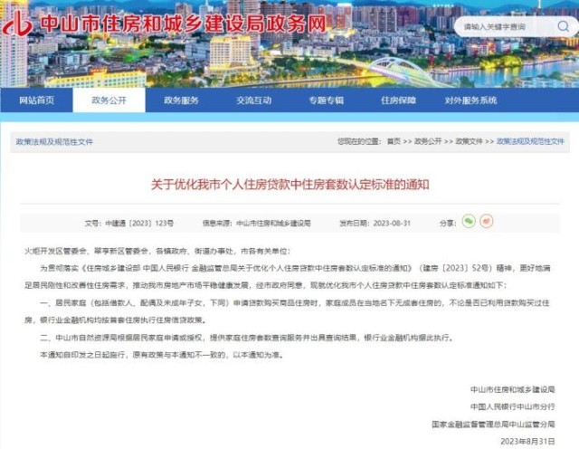 中新網(wǎng)8月31日電 據(jù)廣東省中山市住房和城鄉(xiāng)建設(shè)局網(wǎng)站消息,31日,中山市住房和城鄉(xiāng)建設(shè)局、中國(guó)人民銀行中山市分行、國(guó)家金融監(jiān)督管理總局中山監(jiān)管分局等三部門聯(lián)合發(fā)布《關(guān)于優(yōu)化我市個(gè)人住房貸款中住房套數(shù)認(rèn)定標(biāo)準(zhǔn)的通知》。通知提出,居民家庭(包括借款人、配偶及未成年子女,下同)申請(qǐng)貸款購(gòu)買商品住房時(shí),家庭成員在當(dāng)?shù)孛聼o(wú)成套住房的,不論是否已利用貸款購(gòu)買過(guò)住房,銀行業(yè)金融機(jī)構(gòu)均按首套住房執(zhí)行住房信貸政策。