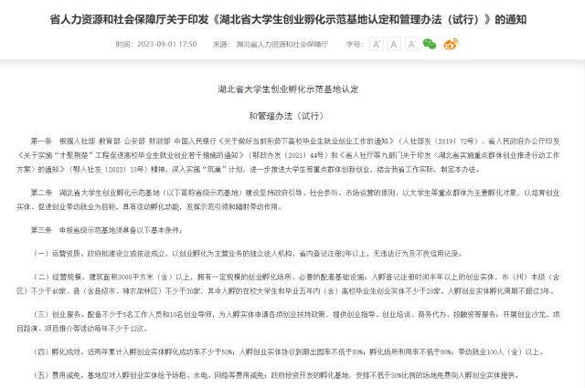 近日,記者從湖北省人力資源和社會保障廳獲悉,為進一步推進大學(xué)生等重點群體創(chuàng)新創(chuàng)業(yè),湖北省出臺《湖北省大學(xué)生創(chuàng)業(yè)孵化示范基地認(rèn)定和管理辦法(試行)》并于發(fā)文之日開始執(zhí)行。