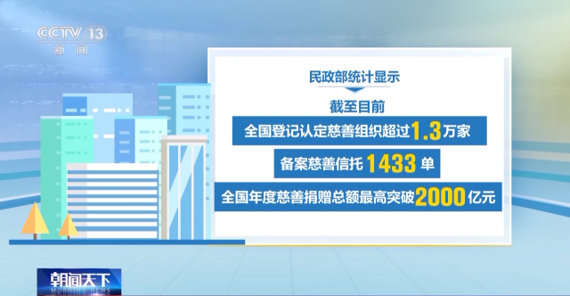 民政部統(tǒng)計(jì)顯示,截至目前,全國登記認(rèn)定慈善組織超過1.3萬家;備案慈善信托1433單;全國年度慈善捐贈總額最高突破2000億元。