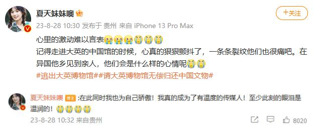 預告片發(fā)布后,up主“夏天妹妹噢”難掩激動之情,她清楚地記得自己走進大英博物館的中國館時,心真的狠狠顫抖了?!耙粭l條裂紋他們也很痛吧,在異國他鄉(xiāng)見到親人,他們會是什么樣的心情呢?”同時,她也為自己真正成為了有溫度的傳媒人而驕傲。