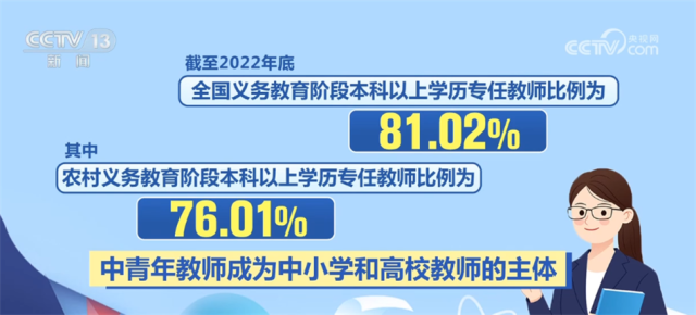近年來(lái),“特崗計(jì)劃”、“三區(qū)”人才支持計(jì)劃教師專(zhuān)項(xiàng)計(jì)劃等源源不斷地為鄉(xiāng)村學(xué)校補(bǔ)充高素質(zhì)教師。優(yōu)師計(jì)劃、師范教育協(xié)同提質(zhì)計(jì)劃、國(guó)優(yōu)計(jì)劃等的實(shí)施,也在助力優(yōu)秀教師的培養(yǎng)。我國(guó)各級(jí)各類(lèi)教師隊(duì)伍學(xué)歷不斷提高、年齡結(jié)構(gòu)不斷優(yōu)化。截至2022年底,全國(guó)義務(wù)教育階段本科以上學(xué)歷專(zhuān)任教師比例為81.02%,其中,農(nóng)村義務(wù)教育階段本科以上學(xué)歷專(zhuān)任教師比例為76.01%,中青年教師成為中小學(xué)和高校教師的主體。