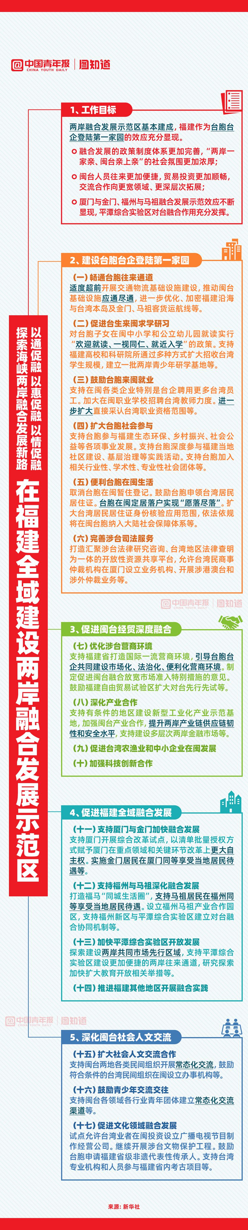 為深化兩岸各領(lǐng)域融合發(fā)展,推進(jìn)祖國和平統(tǒng)一進(jìn)程,中共中央、國務(wù)院近日印發(fā)《關(guān)于支持福建探索海峽兩岸融合發(fā)展新路 建設(shè)兩岸融合發(fā)展示范區(qū)的意見》,以通促融、以惠促融、以情促融,有哪些最新措施,一圖了解收藏。