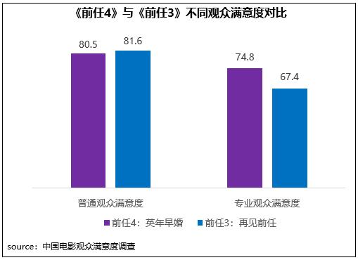 《前任4:英年早婚》在同系列影片輕松、寫實創(chuàng)作風(fēng)格基礎(chǔ)上,進(jìn)階到婚姻話題探討,并進(jìn)一步強(qiáng)化對觀眾現(xiàn)實情感生活的細(xì)致洞察,成為當(dāng)代人的愛情圖鑒。在不同觀眾評價中,影片相對更受專業(yè)觀眾的青睞,專業(yè)觀眾滿意度得分74.8分,高于上一部作品7.4分,其中精彩對白、傳播方式得分居檔期第二和第三位;但普通觀眾對其評價一般,滿意度得分80.5分,比上一部低1.1分。