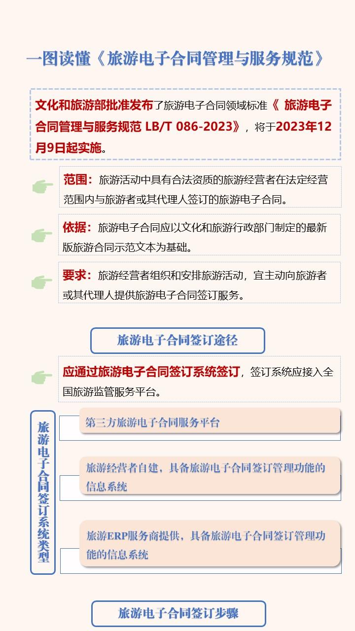 日前,文化和旅游部批準(zhǔn)發(fā)布了旅游電子合同領(lǐng)域的行業(yè)標(biāo)準(zhǔn)《旅游電子合同管理與服務(wù)規(guī)范》(以下簡稱“標(biāo)準(zhǔn)”),將于2023年12月9日起實(shí)施。文化和旅游部今天正式發(fā)布該規(guī)范的解讀。