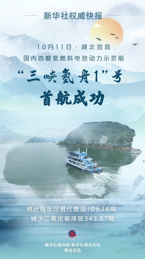 氫燃料電池動力示范船“三峽氫舟1”號10月11日上午在湖北宜昌三峽游客中心(九碼頭)完成首航,這標志著氫燃料電池技術在內(nèi)河船舶應用實現(xiàn)零的突破。據(jù)測算,“三峽氫舟1”號相比傳統(tǒng)燃油動力船舶,預計每年可替代燃油103.16噸,減少二氧化碳排放343.67噸。