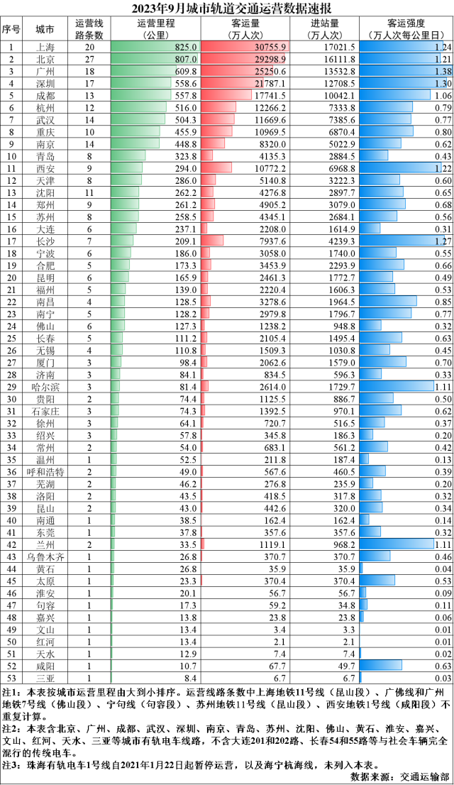 2023年9月,31個?。ㄗ灾螀^(qū)、直轄市)和新疆生產(chǎn)建設兵團共有55個城市開通運營城市軌道交通線路299條,運營里程9859.5公里,實際開行列車318萬列次,完成客運量24.9億人次,進站量14.9億人次。9月份,客運量環(huán)比減少2.2億人次、降低8.2%,同比增加7.1億人次、增長40%,較2019年月均客運量增加5億人次、增長24.9%。9月份客運強度平均水平為0.536萬人次每公里日,較2019年全年客運強度平均水平降低1.8%。