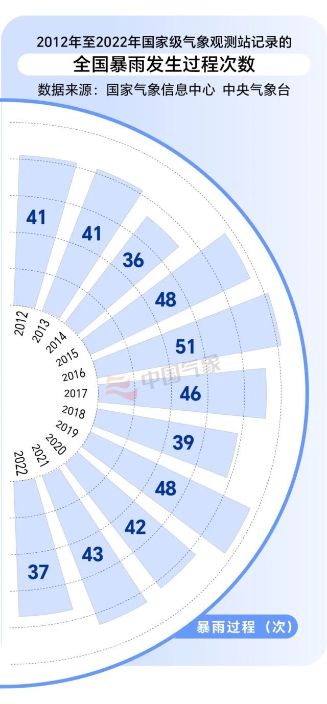 我們通過數(shù)據(jù)了解下我國近年來的暴雨發(fā)生頻次。2012年至2022年間,我國共發(fā)生暴雨天氣過程472次,年均發(fā)生次數(shù)約為42.9次;2016年暴雨發(fā)生次數(shù)最多,為51次;2014年最少,為36次(2023年未結(jié)束,暫不計(jì))。