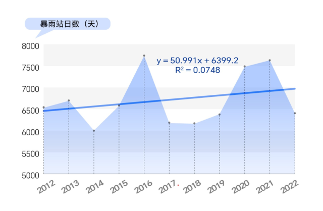 數(shù)據(jù)統(tǒng)計(jì)顯示,2012年至2022年,我國暴雨站日數(shù)有明顯的增加趨勢(shì)。這意味著,2012年到2022年,我國暴雨天氣過程的持續(xù)時(shí)間或影響范圍有增加(擴(kuò)大)的趨勢(shì)。