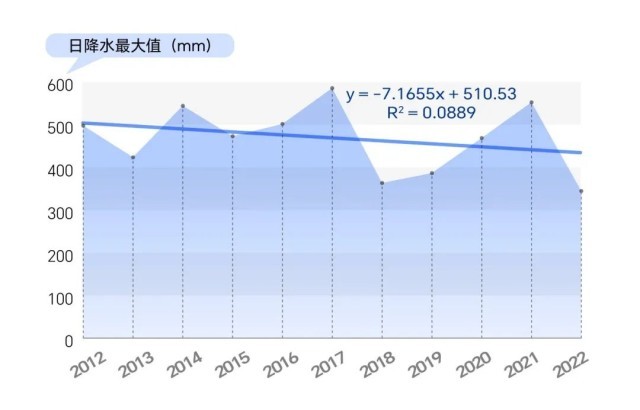 2012年至2022年國家級(jí)氣象觀測(cè)站記錄的最大單日降水量變化趨勢(shì)(單位:毫米)