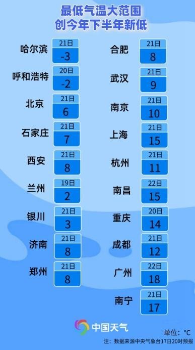 中東部地區(qū)最低氣溫的低點大多在20—21日,從黑龍江到廣東、廣西,大部地區(qū)最低氣溫都有可能創(chuàng)下今年立秋以來的新低,迎來最涼早晨。