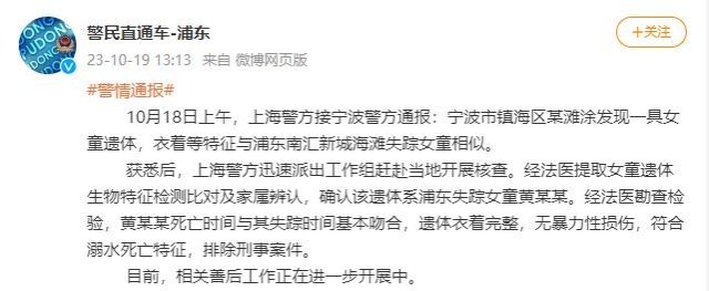 央視網(wǎng)消息:據(jù)@警民直通車-浦東 消息,10月18日上午,上海警方接寧波警方通報(bào):寧波市鎮(zhèn)海區(qū)某灘涂發(fā)現(xiàn)一具女童遺體,衣著等特征與浦東南匯新城海灘失蹤女童相似。