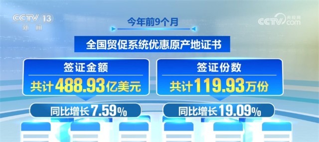 數(shù)據(jù)顯示,今年前9個月,全國貿(mào)促系統(tǒng)累計簽發(fā)原產(chǎn)地證書、ATA單證冊、商事證明書等各類證書455.06萬份,較上年同比增長13.39%。