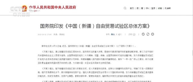 央視網(wǎng)消息:昨天(10月31日),國(guó)務(wù)院印發(fā)《中國(guó)(新疆)自由貿(mào)易試驗(yàn)區(qū)總體方案》,提出賦予新疆自貿(mào)試驗(yàn)區(qū)更大改革自主權(quán),深入開(kāi)展差別化探索,培育壯大新疆特色優(yōu)勢(shì)產(chǎn)業(yè)等政策,明確了提升貿(mào)易便利化水平、強(qiáng)化與周邊國(guó)家經(jīng)貿(mào)合作等25個(gè)方面的具體舉措。自2013年中國(guó)首個(gè)自貿(mào)試驗(yàn)區(qū)在上海掛牌,此次新設(shè)新疆自貿(mào)試驗(yàn)區(qū)已經(jīng)是自貿(mào)試驗(yàn)區(qū)第七次擴(kuò)容。