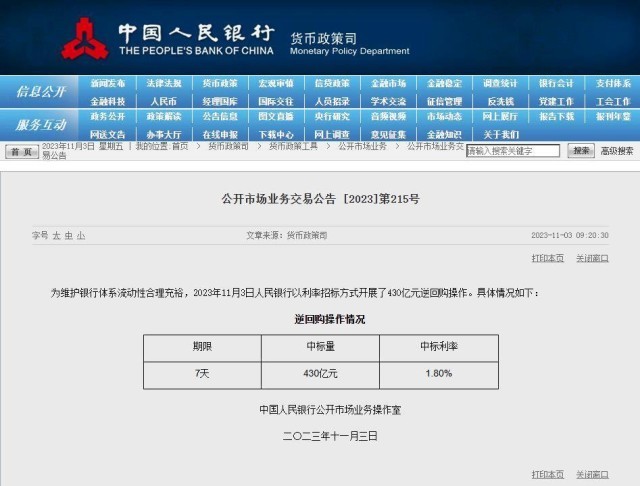 據(jù)央行官網(wǎng)消息,為維護(hù)銀行體系流動(dòng)性合理充裕,2023年11月3日中國(guó)人民銀行以利率招標(biāo)方式開展了430億元逆回購操作。具體情況如下: