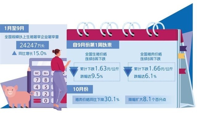 自9月份第1周以來,全國生豬價格連續(xù)8周下跌,累計下跌1.63元/公斤,跌幅達9.5%;全國豬肉價格連續(xù)8周下跌,累計下跌1.66元/公斤,跌幅達6.1%。10月份第4周,全國豬肉平均價格25.60元/公斤,比前一周下跌1.2%,同比下跌38.5%。