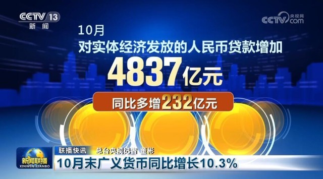 中國人民銀行最新數(shù)據(jù)顯示,10月末,廣義貨幣余額288.23萬億元,同比增長10.3%,增速與上月末持平。10月,社會融資規(guī)模增量為1.85萬億元,比上年同期多9108億元。其中,對實體經(jīng)濟(jì)發(fā)放的人民幣貸款增加4837億元,同比多增232億元。金融持續(xù)增強(qiáng)對實體經(jīng)濟(jì)支持力度。