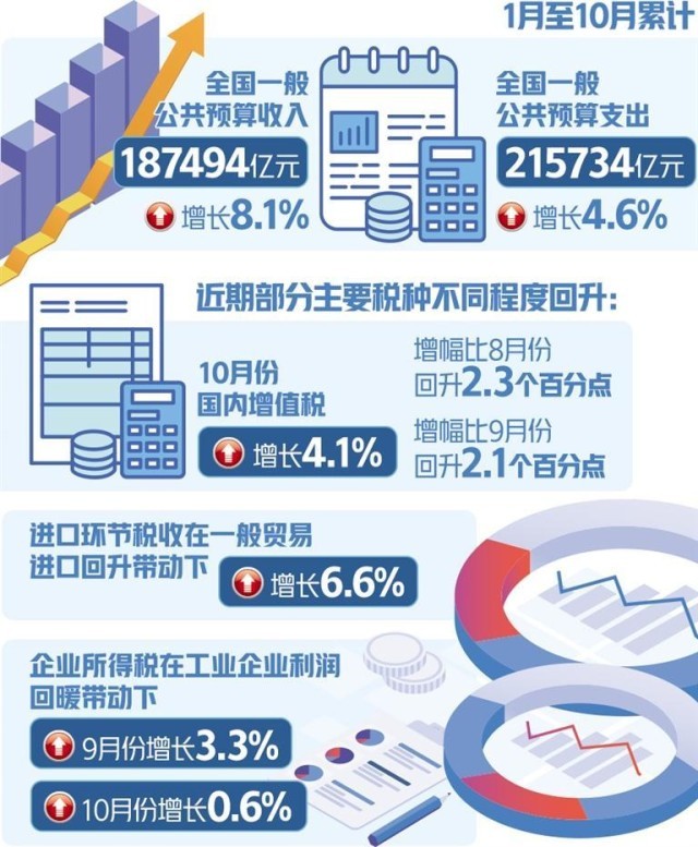 財政收支是經(jīng)濟運行的“晴雨表”。國家統(tǒng)計局最新發(fā)布數(shù)據(jù)顯示,10月份多數(shù)生產(chǎn)需求指標(biāo)同比增速回升,就業(yè)物價總體穩(wěn)定,經(jīng)濟運行延續(xù)恢復(fù)向好態(tài)勢。“部分主要稅種呈現(xiàn)不同程度的回升,反映我國財政收入‘含金量’較高,特別是市場活力進一步恢復(fù),經(jīng)營主體運行質(zhì)量與效益逐步回升。”李旭紅說。