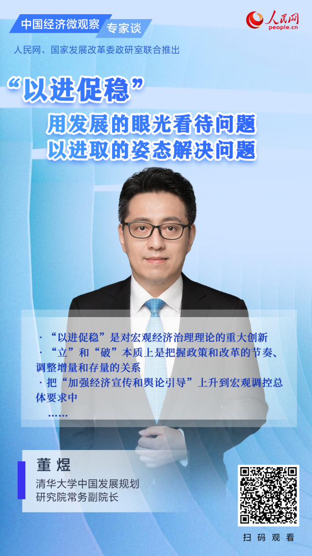 日前,清華大學(xué)中國發(fā)展規(guī)劃研究院常務(wù)副院長董煜做客《中國經(jīng)濟(jì)微觀察·專家談》欄目時(shí)表示,“以進(jìn)促穩(wěn)”是對(duì)宏觀經(jīng)濟(jì)治理理論的重大創(chuàng)新,提出了進(jìn)和穩(wěn)之間基于動(dòng)態(tài)平衡的更高水平要求。他認(rèn)為這是一種新的穩(wěn)定觀,即以發(fā)展眼光看待問題,并以積極進(jìn)取的姿態(tài)解決面臨的安全和穩(wěn)定問題。實(shí)現(xiàn)“以進(jìn)促穩(wěn)”的目標(biāo),要通過結(jié)構(gòu)、質(zhì)量、效益、改革的“進(jìn)”來創(chuàng)造穩(wěn)定發(fā)展的環(huán)境。