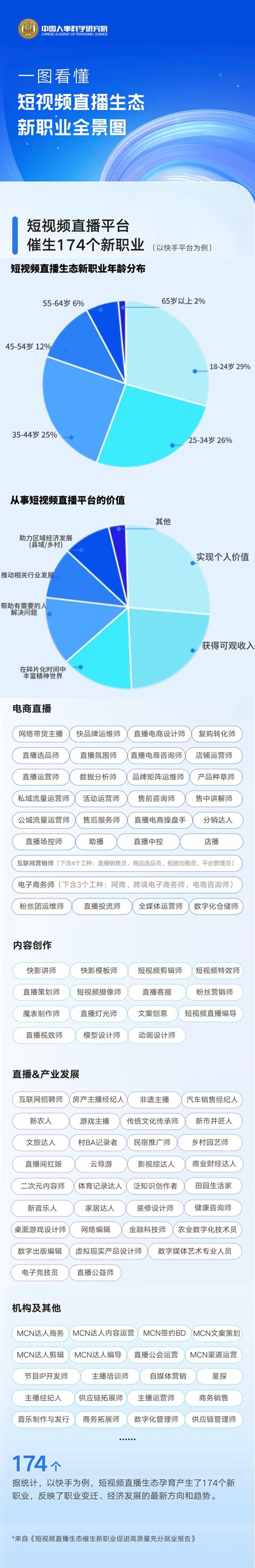 中國人事科學(xué)研究院近期發(fā)布的《短視頻直播生態(tài)催生新職業(yè)促進(jìn)高質(zhì)量充分就業(yè)報(bào)告》顯示,一塊屏幕背后發(fā)生了諸多變化:中青年成短視頻直播生態(tài)新職業(yè)的主力軍。其中,18-24歲占29%,25-34歲占26%,35-44歲占25%。18-34歲占比達(dá)到55%?!吨腥A人民共和國職業(yè)分類大典(2022年版)》的1639個(gè)職業(yè)中,短視頻平臺快手覆蓋八成以上的數(shù)字職業(yè),為勞動者提供了更廣闊的職業(yè)發(fā)展空間。
