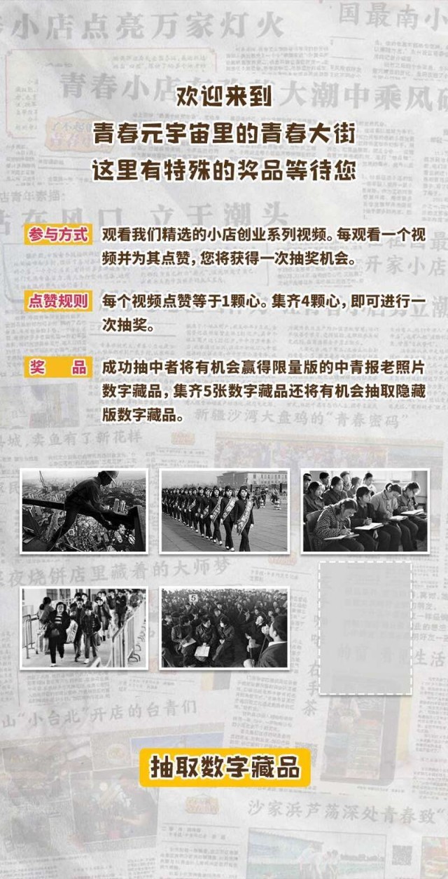奔跑在青春大街上的青小豹邀請(qǐng)讀者一起玩尋找小店的游戲,大家可以邊體驗(yàn)邊觀(guān)看一個(gè)個(gè)小店和店主的故事,參加愛(ài)心點(diǎn)贊,還可以參與抽獎(jiǎng)。獎(jiǎng)品是用區(qū)塊鏈技術(shù)創(chuàng)制的數(shù)字藏品——改革開(kāi)放45年以來(lái)中國(guó)青年報(bào)拍攝的精彩照片。